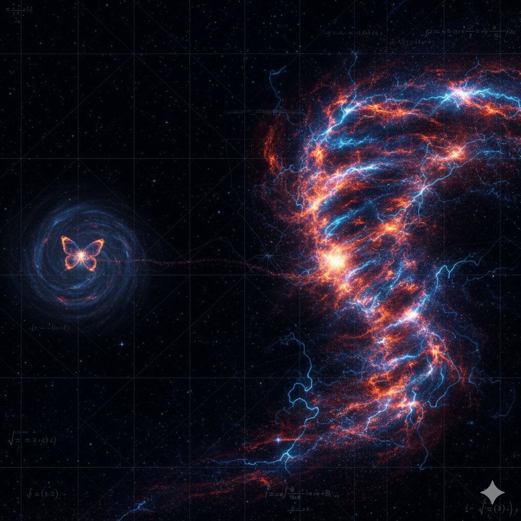 하지만 잠시 후, 믿을 수 없는 일이 벌어졌습니다. 두 그래프는 서서히 벌어지기 시작하더니, 이내 완전히 다른 날씨 패턴을 그려냈습니다. 로렌츠는 자신의 실수가 아니라, 시스템 자체가 가진 본질적인 특성임을 깨달았습니다. 그는 이 발견을 1963년 "결정론적 비주기 흐름"이라는 논문으로 발표했고, 훗날 한 강연에서 이 현상을 설명하며 그 유명한 질문을 던집니다. "브라질에서의 나비의 날갯짓이 텍사스에서 토네이도를 일으킬 수 있는가?" 나비 효과(Butterfly Effect)가 탄생하는 순간이었습니다.