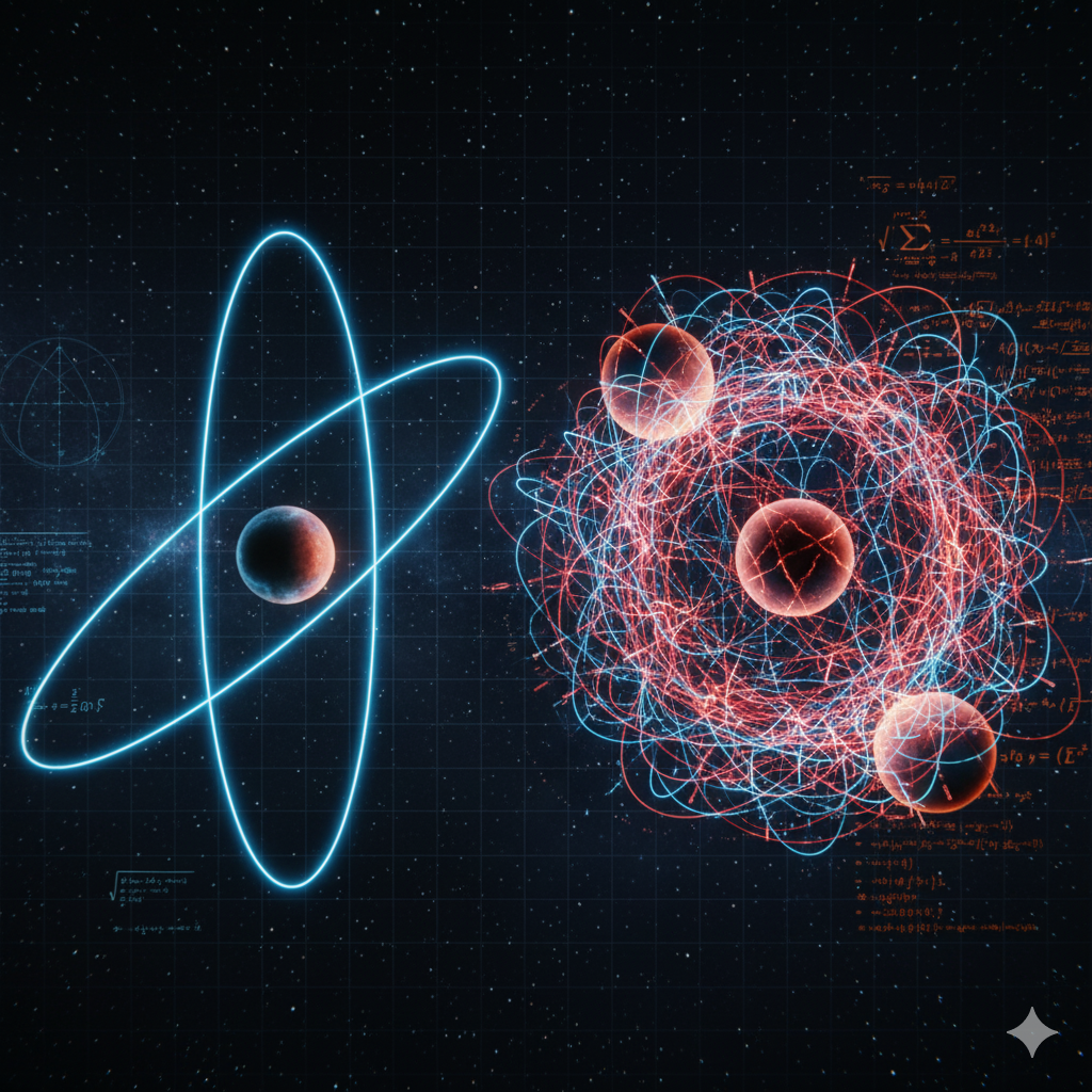그는 행성의 정확한 위치를 계산하는 대신, 시스템 전체의 움직임이 어떤 모양을 그리는지에 집중하는 기하학적인 접근법을 사용했습니다. 그리고 충격적인 사실을 발견합니다. 세 천체의 궤도는 결코 똑같이 반복되지 않으면서(비주기적), 서로 복잡하게 얽혀 있었습니다. 무엇보다 중요한 발견은, 초기 위치가 눈에 보이지 않을 만큼 아주 약간만 달라도, 시간이 흐르면서 그 결과는 완전히 다른 궤도로 이어진다는 사실이었습니다.